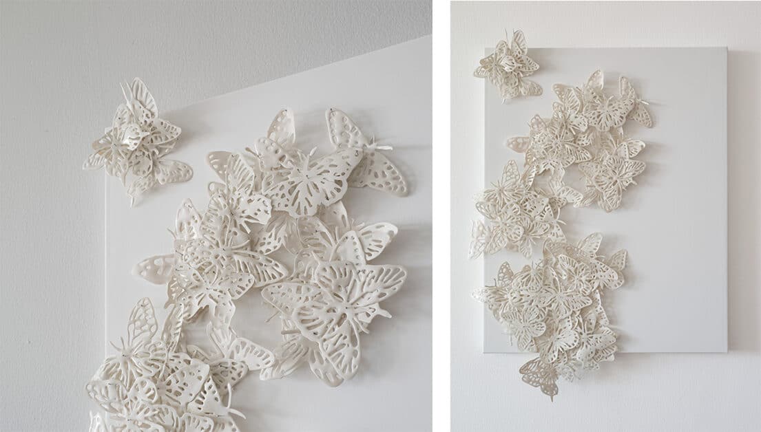 日本大学芸術学部卒業。東京での活動を経て結婚を機に渡米。白を基調とした繊細な色彩と日本的美意識に基づく作品を発表。大手町駅構内や老舗店舗のパブリックアートも手掛ける。近年は「記憶」と「再生」をテーマに、立体要素と平面を融合した新シリーズを展開。
