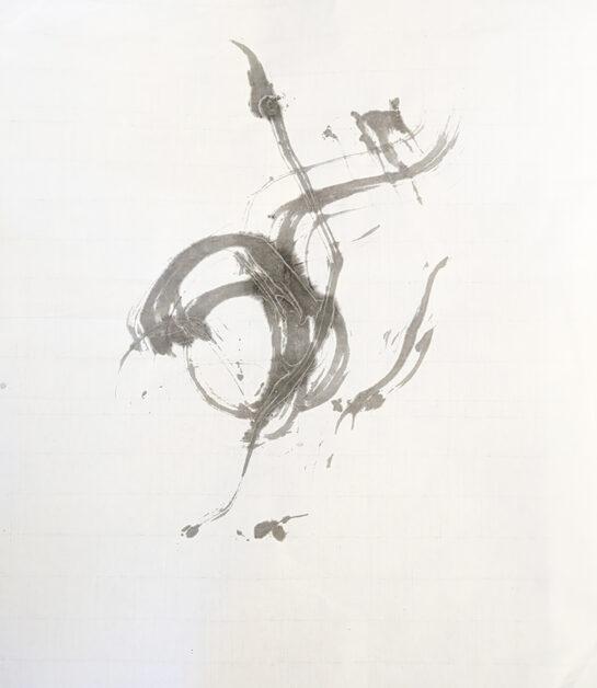 見えているものは、ほんの表層にすぎません。墨は沈み、線は迷い、書は意味を失うことで心の深層へと触れていきます。墨の滲み、掠れ、重なりは、理性の膜を破り、意識の奥へと沈み込む軌跡です。そこにあるのは答えではなく、深さそのもの。意味が発生する直前、思考がかたちになる手前。ここにあるのは言葉ではなく、痕跡であると、伊藤は語ります。