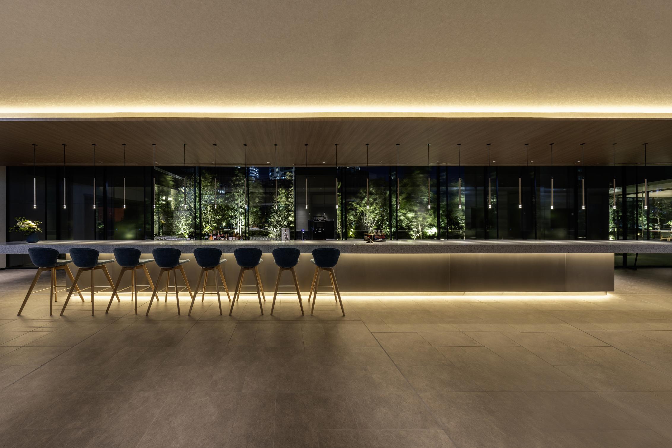 为了使设计与周围的众多历史建筑和历史风貌相融合、相协调,室内设计充分利用了日本建筑特有的直线条,而图案则采用了石灰华色与温暖的粉青铜色细节的结合,创造出一个意想不到的西式设计空间。胡桃木的使用也给人一种奢华的感觉。